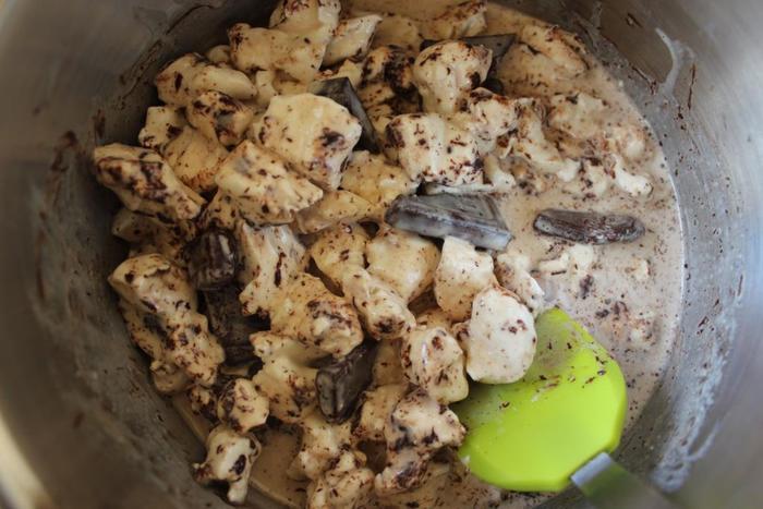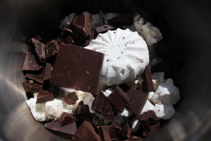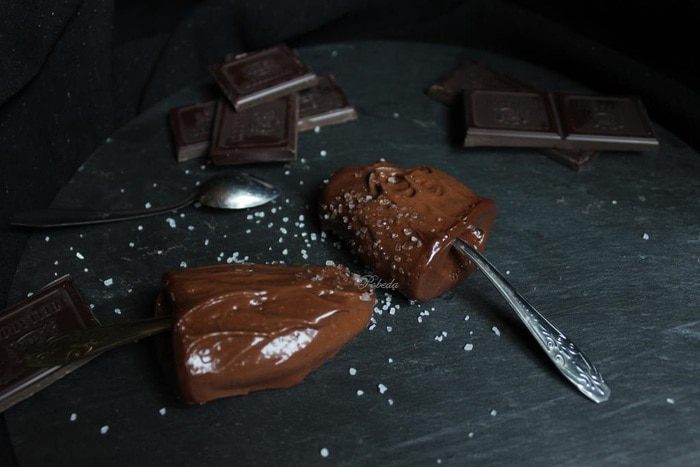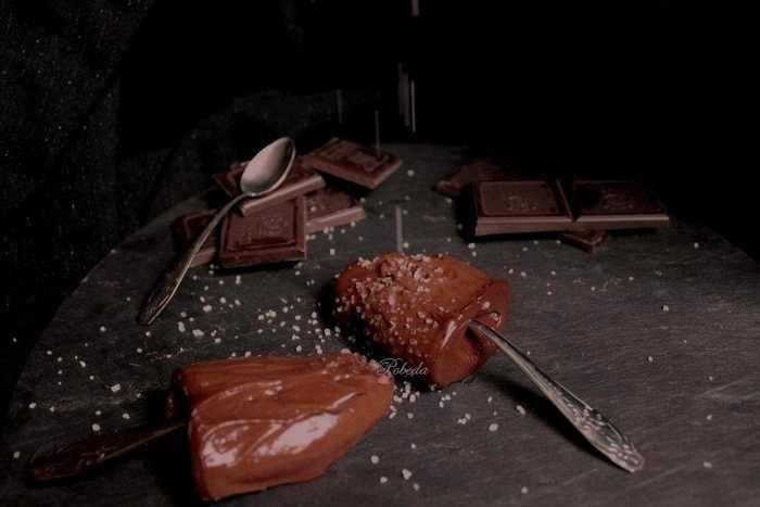 Через пару часов, когда десерт достаточно схватится, но еще не замерзнет полностью, вставляем в него палочки (если хотим на палочке).