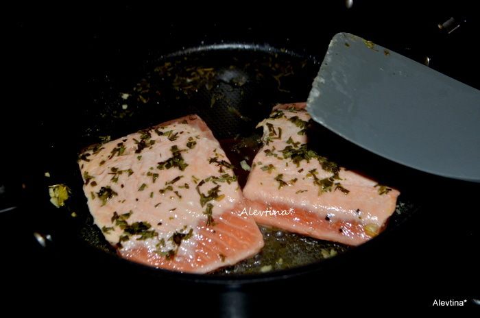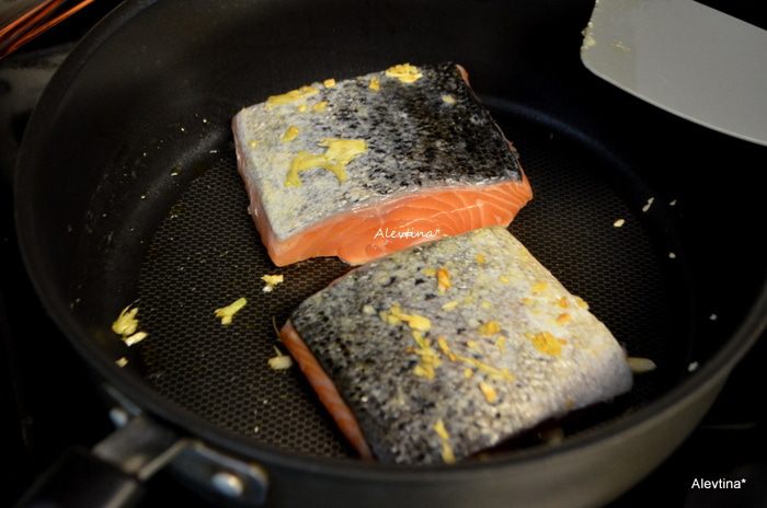 На горячую сковороду выложить масло кусочек, чеснок раздавленный. Затем филе семги и обжаривать 2 минуты сторона.
