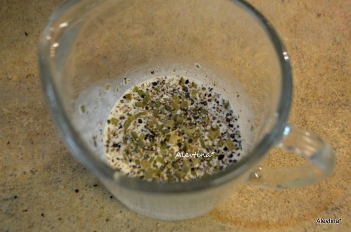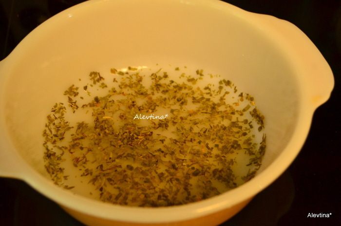 Смешать в емкости сухой эстрагон и порезанный сухой шнитт-лук . Залить сухим вином (dry white vermouth).