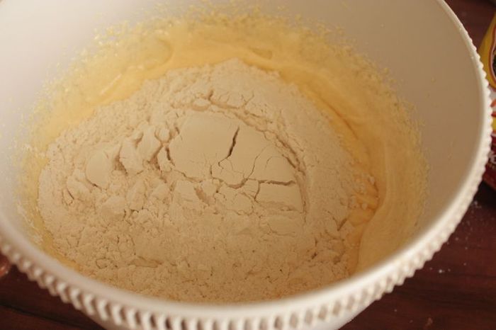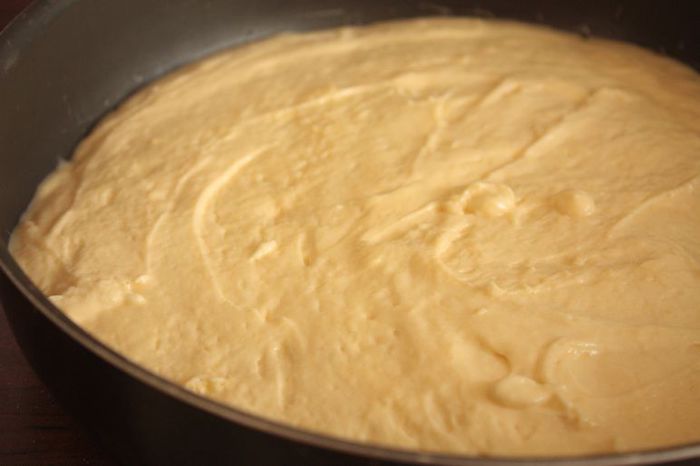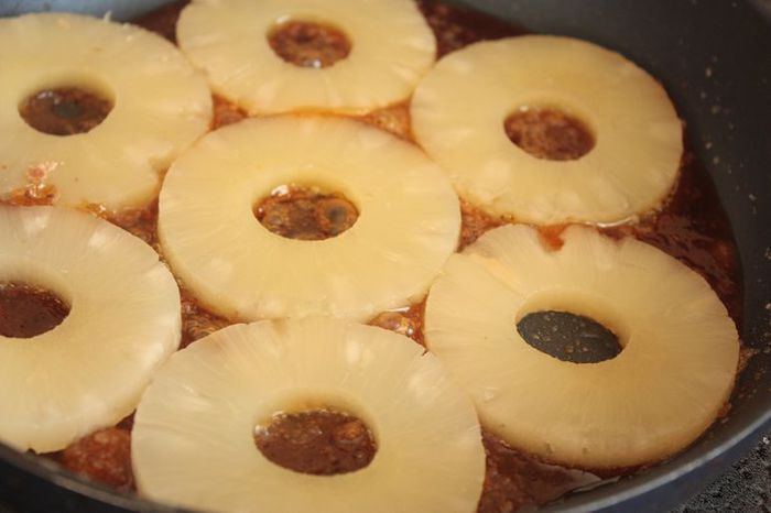 Как только будут ананасы готовы, сразу перекладывайте их в форму для выпечки (ее необходимо чуть-чуть смазать сливочным маслом). Оставшейся карамелью, пока она не застыла окончательно и находится в жидком виде, полейте ананасы. Сверху выложите тесто, разровняйте и хорошенько постучите формой по столу, чтобы вышел весь лишний воздух.