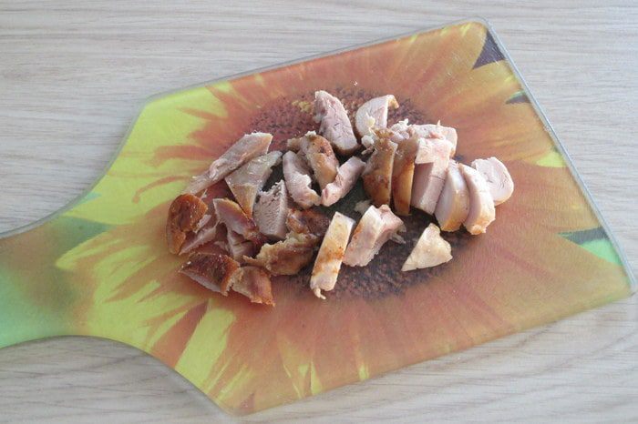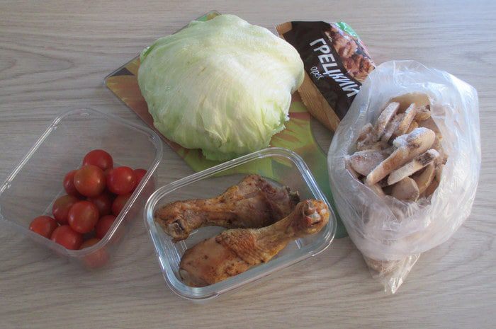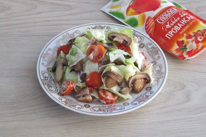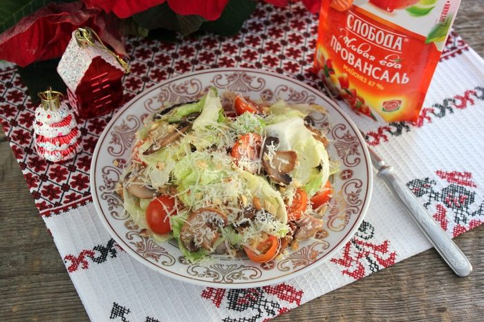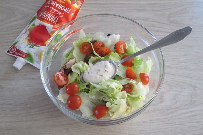 Куриные голени (или другое куриное мясо) для салата нужны уже готовые, поэтому заранее запеките их или пожарьте. Помидоры подходят любого размера, а не только черри. Если имеются свежие шампиньоны, то отдайте предпочтение им. За неимением салата айсберг возьмите сочную и хрустящую пекинскую капусту. Кроме твердого сыра можно взять полутвердый на свой вкус.
