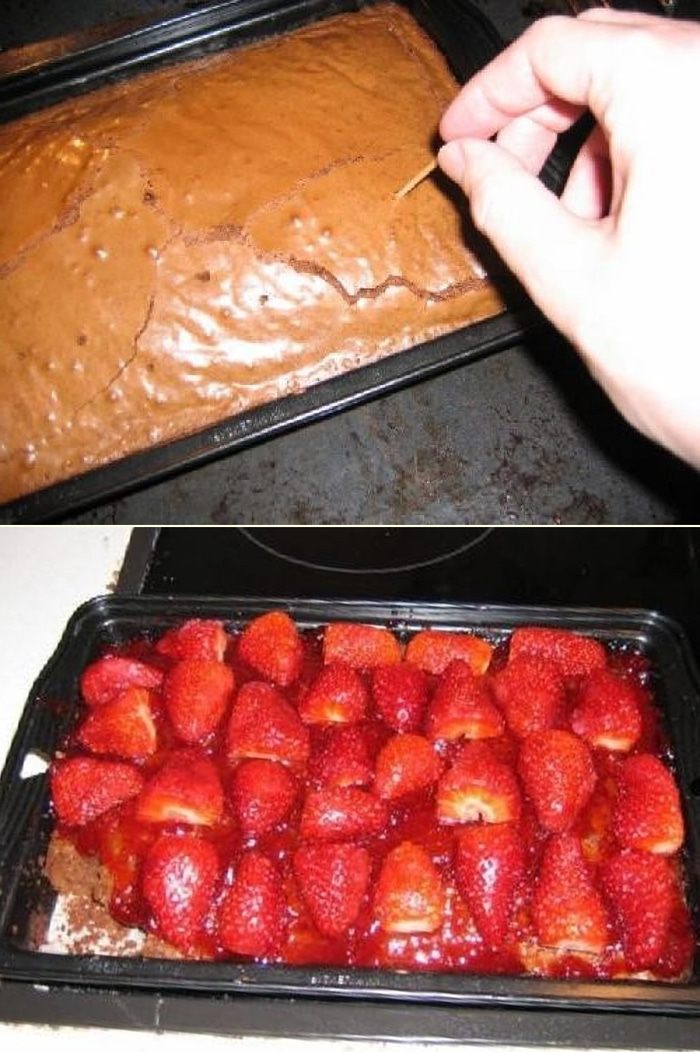 Важно! Прежде чем положить клубничный джем на вершину пирога позвольте пирогу немного остыть. А затем порежьте клубнику пополам и положите её поверх джема.