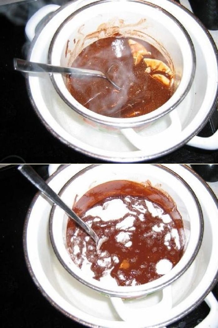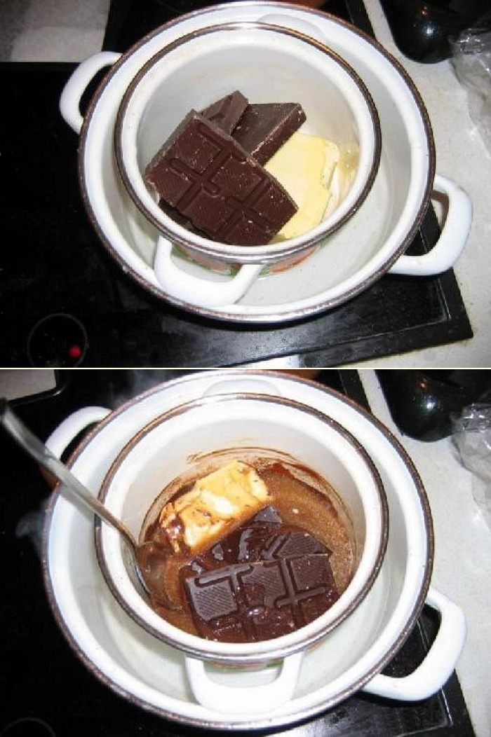 Заполним дно большой кастрюли на 2 сантиметра водой и поставим на плиту греться. Затем поместим небольшую кастрюлю внутрь большой и положим масло и шоколад в эту маленькую кастрюлю. Нагреваем чтобы масло и шоколад начали таять.
