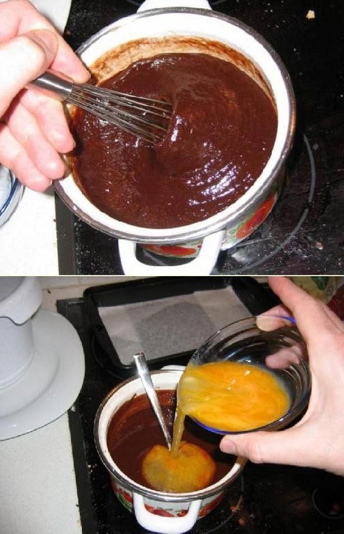 Взбиваем яйца с ванильным сахаром. А теперь добавим взбитые яйца в кастрюлю с растопленным шоколадом и маслом...