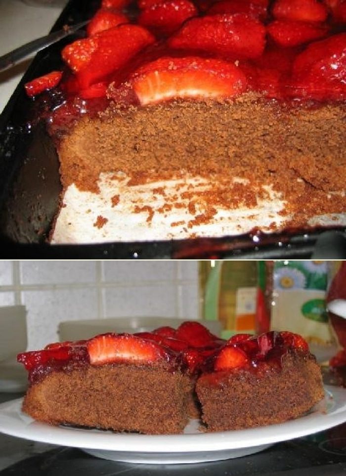 Так наш пирог выглядит вблизи. После того как пирог остынет порежем его на части чтобы получить пирожные и разделить их с нашими любимыми. Теперь и вы узнали подробно изучили как сделать наивкуснейшее пирожное для настоящих любителей десертов - шоколадные пирожные с клубникой в желе.