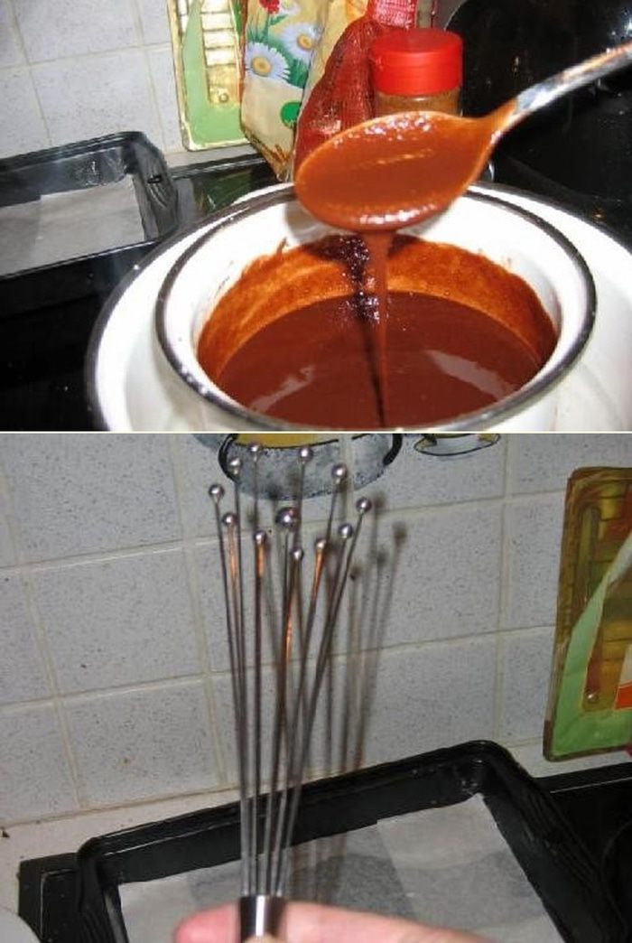 Когда всё растает то должно получиться вот такой консистенции. Снимаем кастрюлю с плиты и даём остыть в течение минуты. А в это время возьмем венчик в руки.