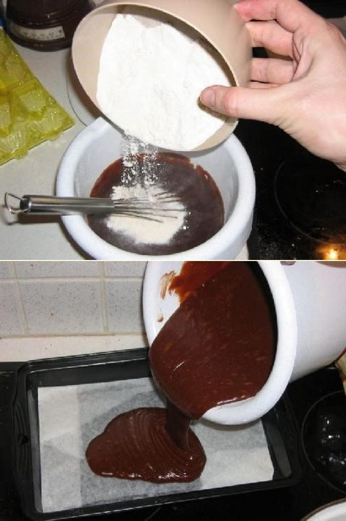 Теперь добавим муку и снова всё тщательно перемешаем. Полученную смесь нальём в форму для выпечки и поставим в духовку (заранее разогретую до 180 градусов).
