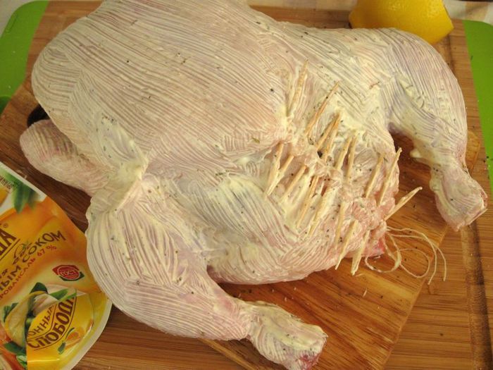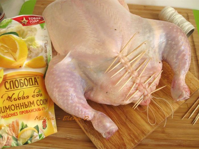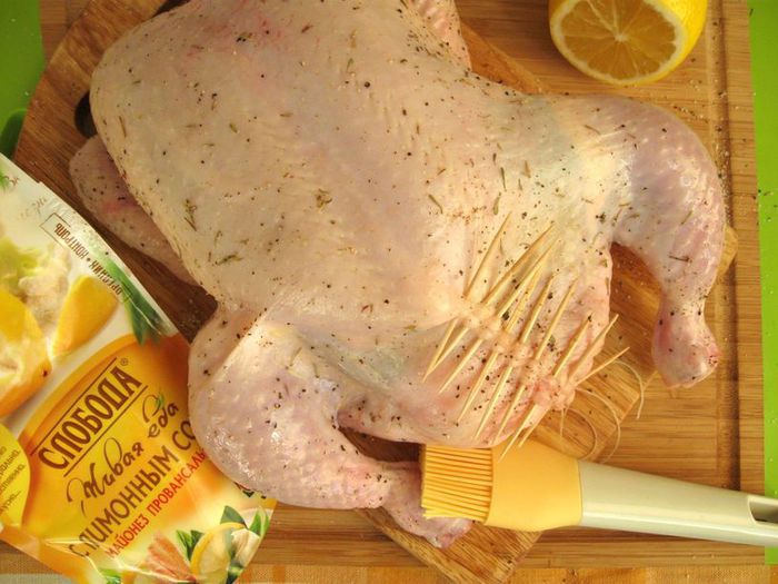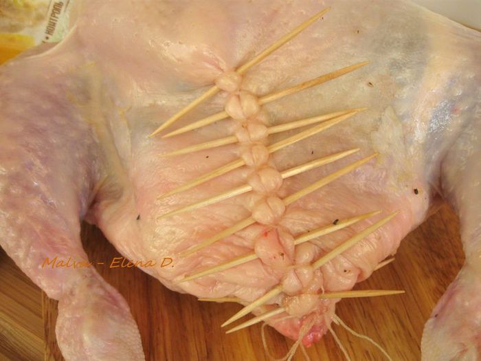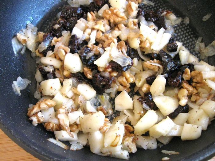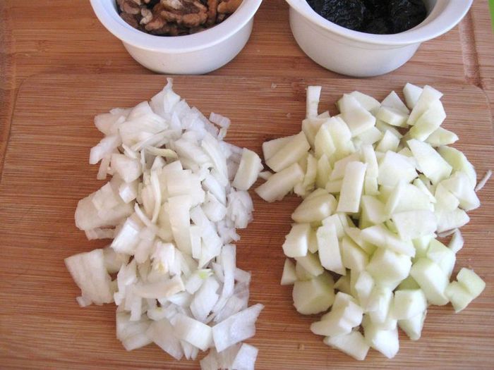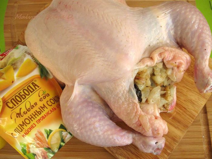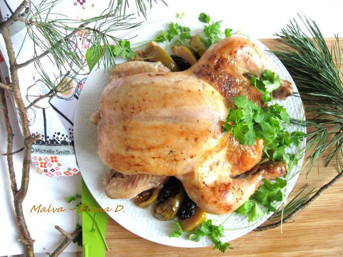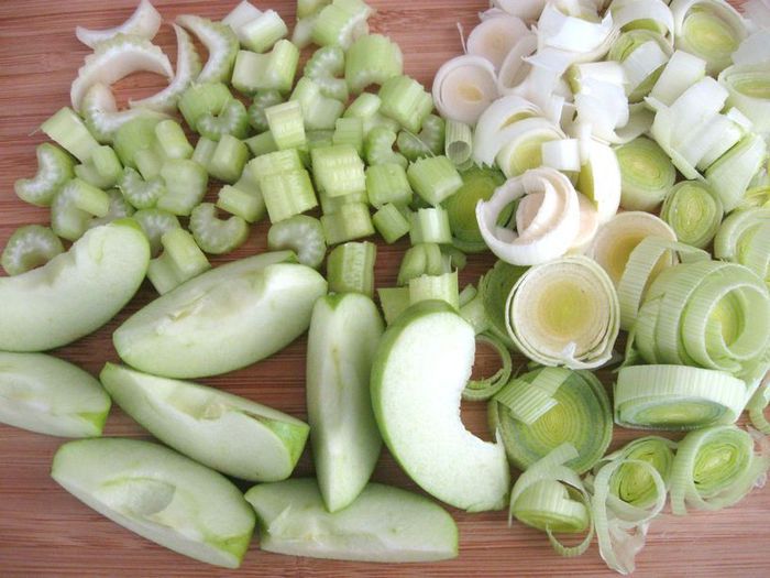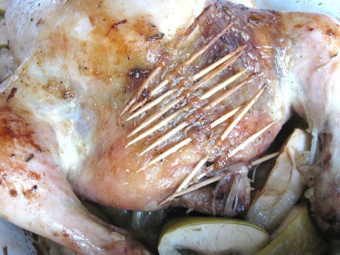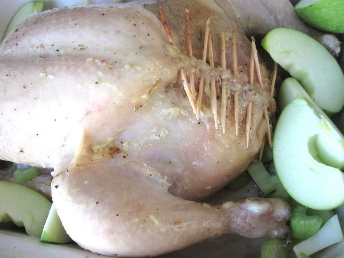Через 1 час после запекания обложить курочку дольками зеленых яблок, кусочками стебля сельдерея. Поливать выделяющимся соком от курицы, яблок и сельдерея. Лук порей я обжарила на сковороде отдельно. На запекание курицы у меня в общей сложности ушло чуть больше полутора часов, в конце запекания минут на 10 — 15 температуру духовки можно увеличить до 200°С.