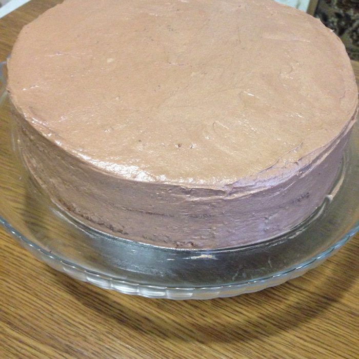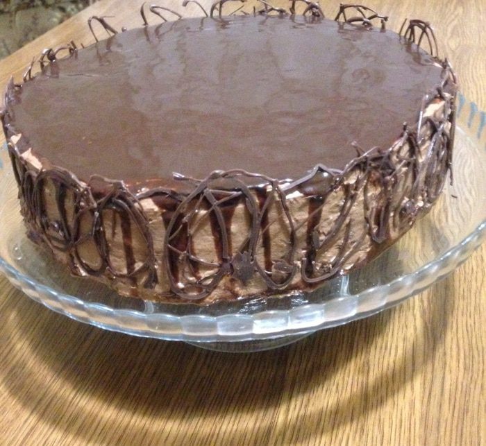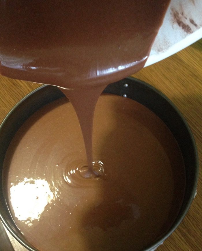 Достаем торт из холодильника поливаем глазурью, я использовала половину, так как не хотела чтоб глазурь полностью покрыла бока торта.