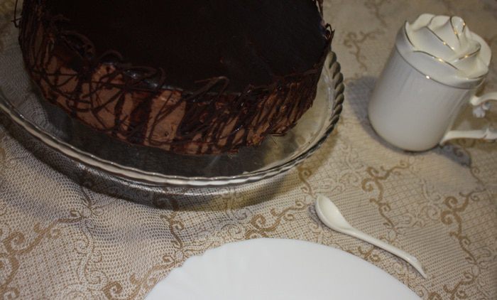 Делаем шоколадное кружево, меряем высоту торта прибавляет пол сантиметра, отмечаем длину и ширину на пергаменте. Растапливаем шоколад в микроволновке, переливаем шоколад в пакет и отрезаем маленькую дырочку, либо делаем кулёк из пергамента, и рисуем то, что хотим на пергаменте, на 1 минуту отправляем наше кружево в холодильник, шоколад чуть чуть схватится, но не застынет. Достаем из холодильника ленты из пергамента. Оборачиваем ими торт, шоколадом внутрь. Приглаживаем, слегка прижимаем. Ставим торт на минут 15 в холодильник. Вынимаем, и аккуратно снимаем пергамент. Ставим торт на несколько часов для пропитки в холодильник.