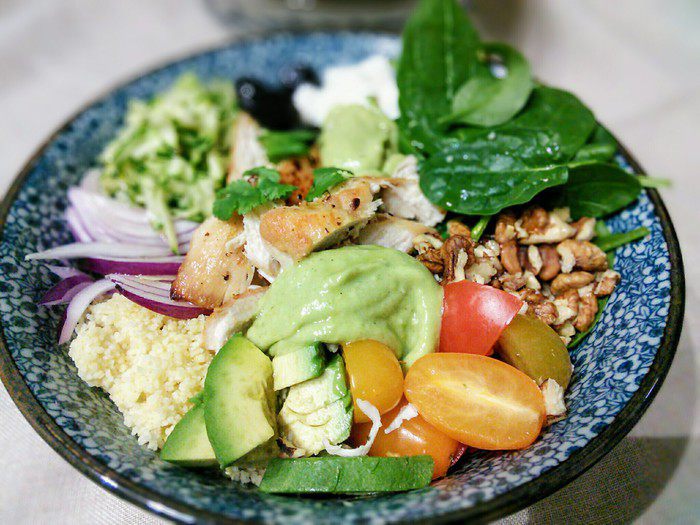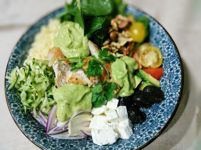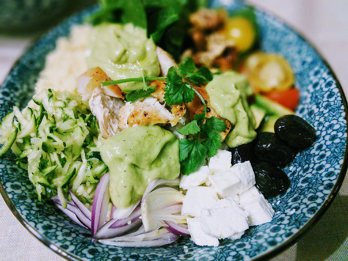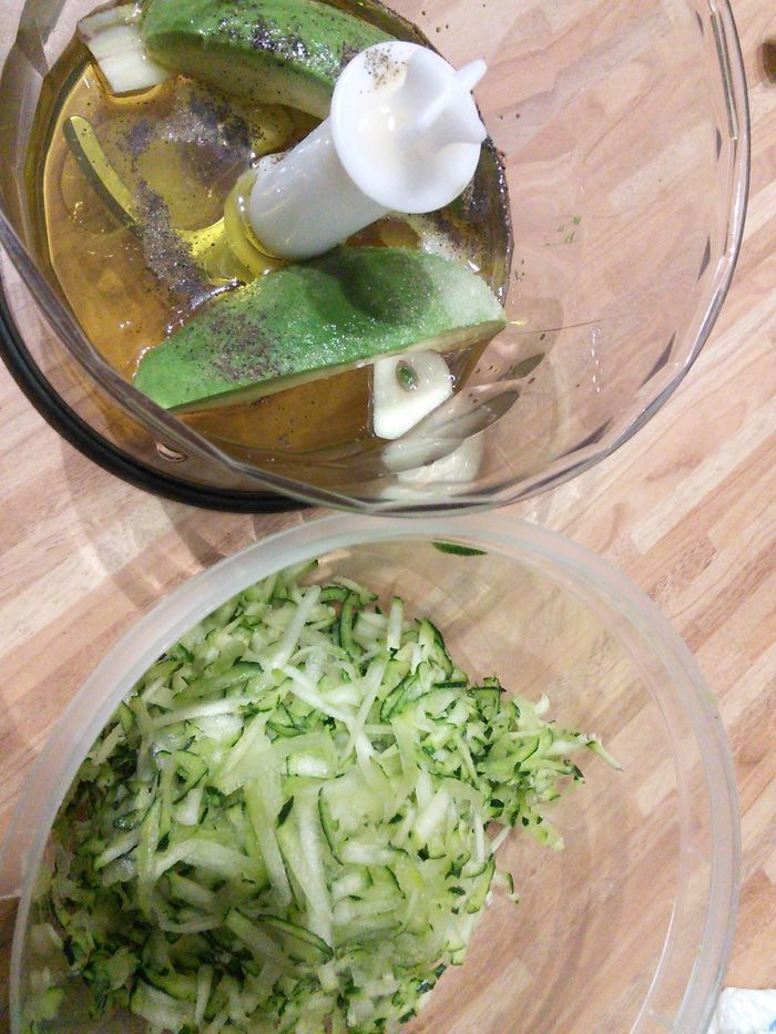 В миксере взбить чеснок с 1 спелым авокадо, соком лимона, оливковым маслом, солью и перцем. Это заправка, она должна настояться. Я делала это блюдо уже 2 раза. В первый раз вместо авокадо брала 2 запеченных и очищенных болгарских перца. Оба варианта мне понравились.
