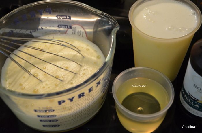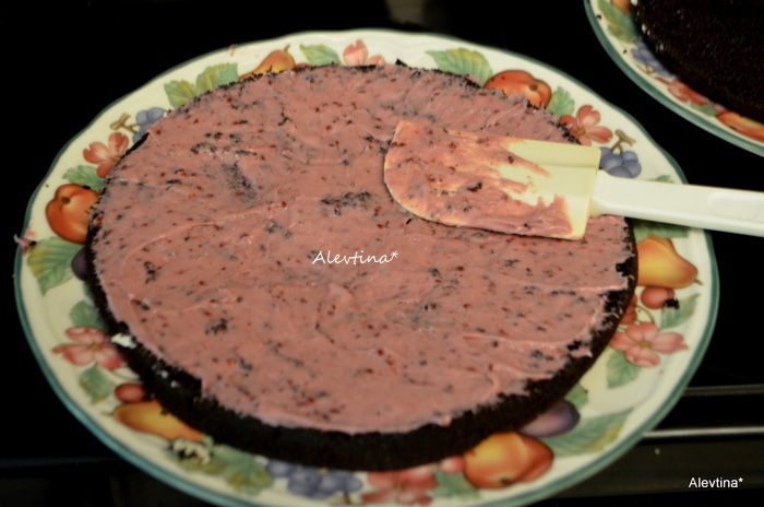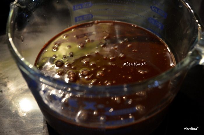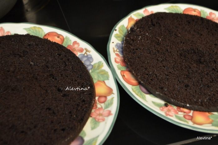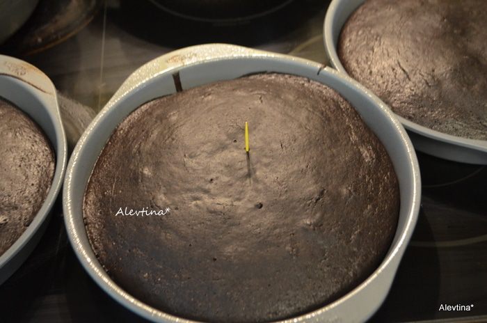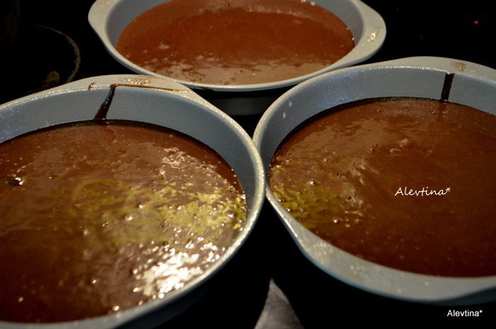 В сухую смесь добавить смесь из яиц и кефира,масла. Перемешать, затем кофейную смесь с шоколадом,перемешать. Разделить тесто на 3 равные части и распределить по формам. Поставить в горячую духовку на 30 минут на 3 формы (и увеличьте дважды время выпекания , если вы делаете в одной разъемной форме).