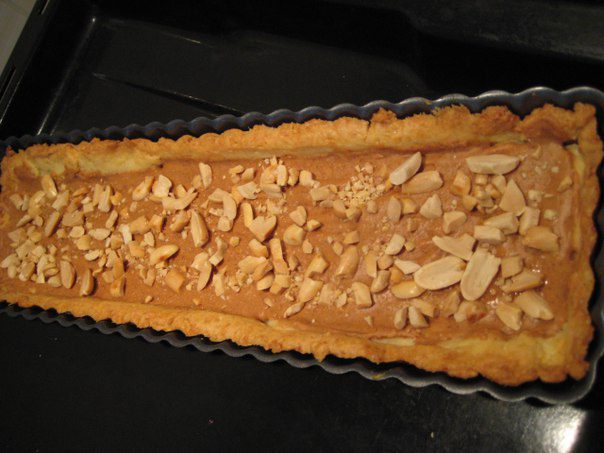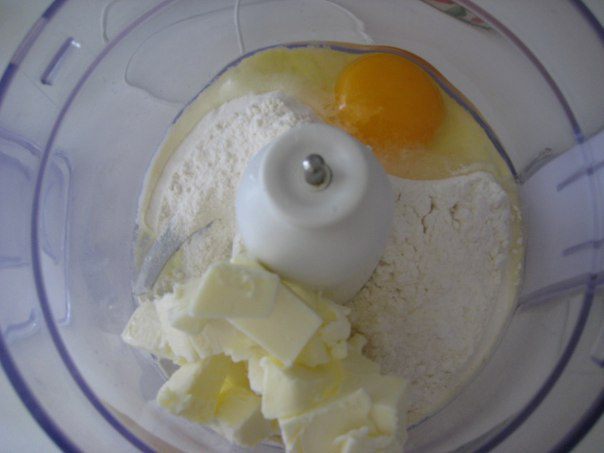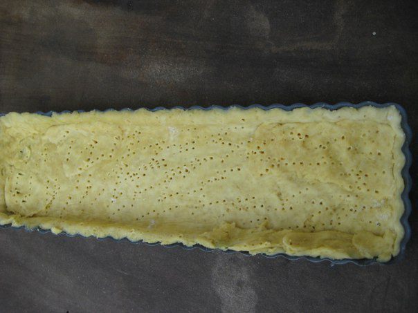 Духовку разогреть до 180С. Тесто раскатать, выложить в форму, смазанную маслом, свисающие края срезать скалкой. Наколоть вилкой. Поставить форму с тестом на 20 минут в холодильник. Положить на тесто "груз" (горох или фасоль), выпекать 20 минут. "Груз " убрать и выпекать еще 10 минут до золотистого цвета.