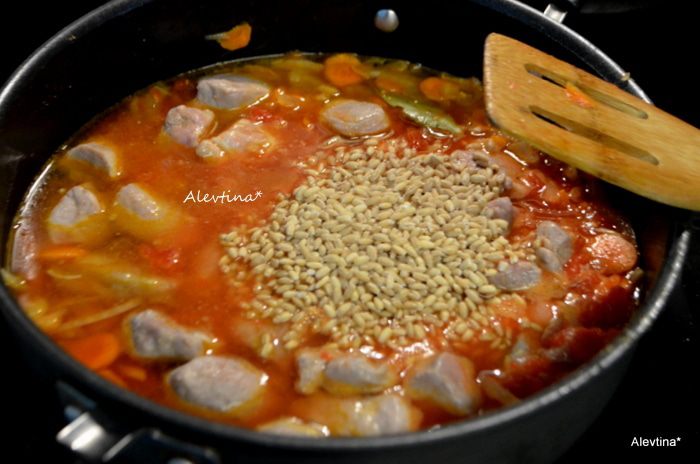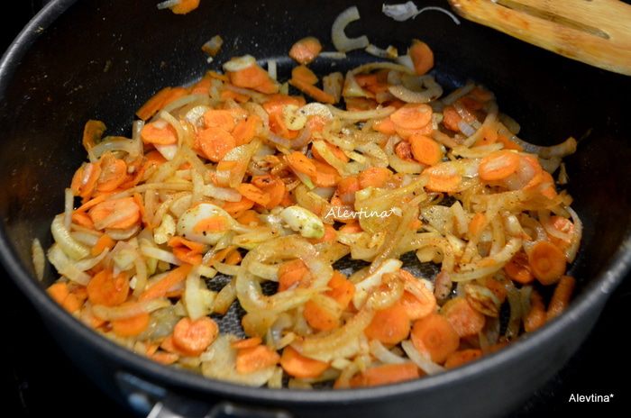 Для тех кто использует брюкву, очистить и порезать наполовину, а затем тонко слайсами. Я делала без брюквы. Луковицу очистить и порезать тонко, морковь очистить и порезать также тонко. Чеснок очистить и порубить. Обжариваем вначале на масле 1 ст. л. лук и чеснок до мягкости или 4 мин. ,посолить и добавить тмин, папарику и черный перец. Затем добавим брюкву и морковь и обжариваем еще 4 минут.