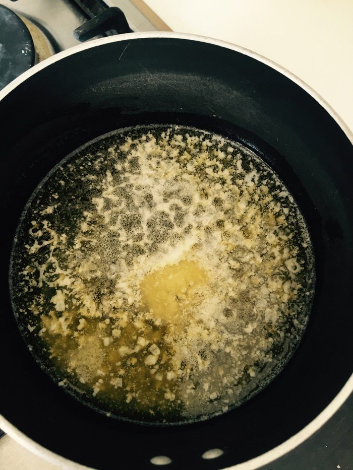 Переходим к тесту. Превращаем наше сливочное масло в так называемое "ореховое"': для этого ставим его на маленький огонь, даем растопиться, немного побурлить, покипеть до тех пор пока оно не станет коричневеньким и начнет источать ореховый аромат. Отставить, остудить.