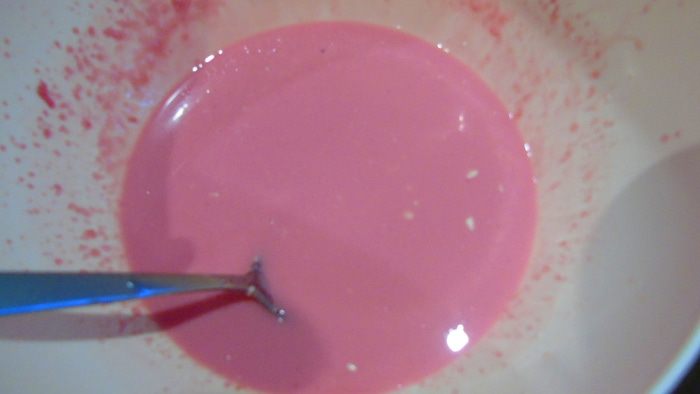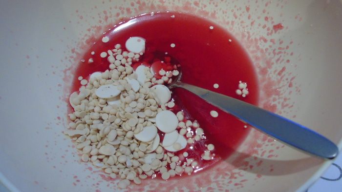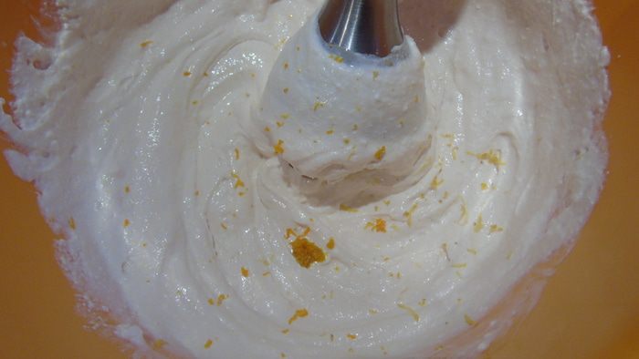Добавьте белый шоколад и хорошо размешайте, чтоб все стало однородным. Добавьте апельсиновый сок, выжатый из 1 апельсина.