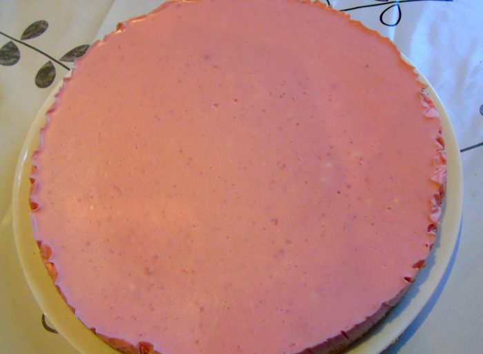 Форму выложите пленкой (диаметр 23 см). Масло растопите с смешайте с печеньем. Выложите в форму и утрамбуйте. Отправьте в холодильник.