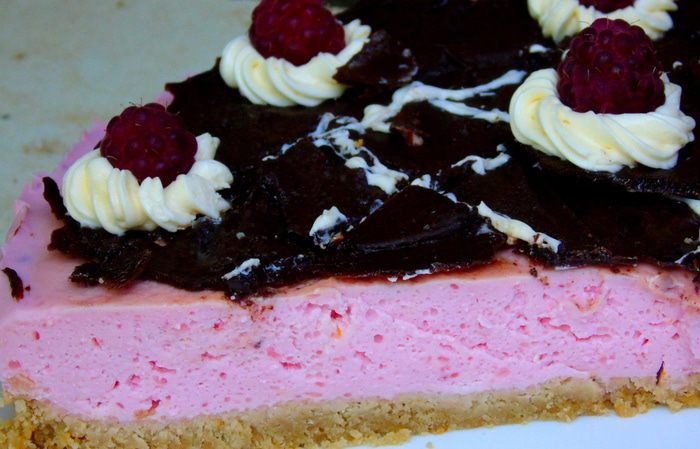 Вкуснейший десерт из хрустящего коржа, не требующего выпекания, сливок, малины и шоколада вы приготовите быстро, но не так быстро, как его съедят :)