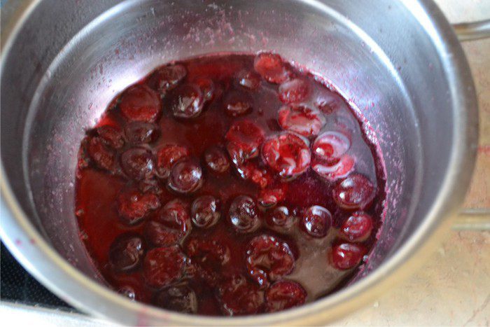 Для вишневого топпинга 20 ягодок вишни мы разрезаем пополам, вынимаем косточки и ложем в кастрюльку. Добавляем сахарный песок и все нагреваем на небольшом огне помешивая. Увариваем вишню минут 10, затем добавляем крахмал разведенный в небольшом количестве холодной воды. Помешиваем до загустения.