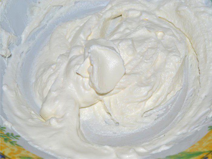 Сливки взбиваем до устойчивых пиков и добавляем поровну в крема с былым и черным шоколадом.