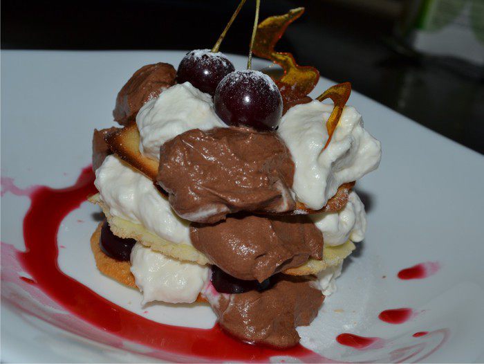 Нежный, творожный вкус рикотты и белого шоколада с капелькой рома, в сочетании с насыщенностью темного шоколада, вместе гармонируя создают гамму вкуса. А солирует тут спелая вишня, кислинкой оттеняя сладость и нежность шоколада.