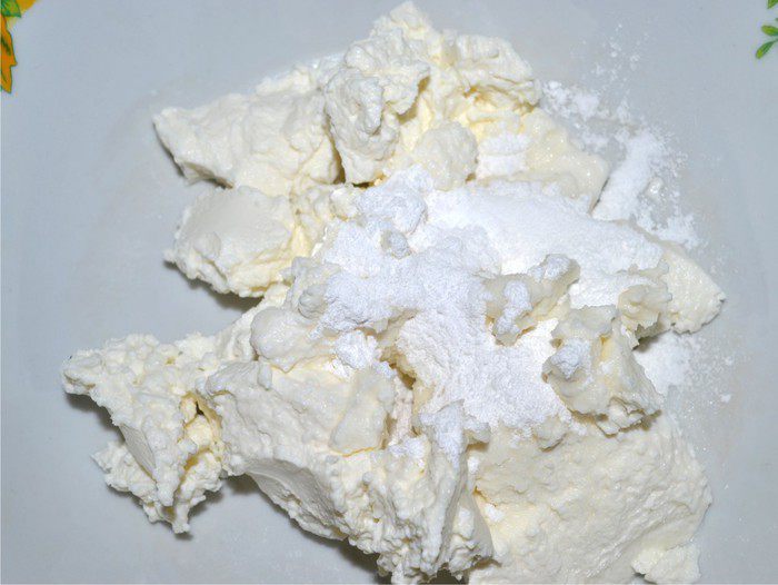 Делаем сырный крем. Рикотту выкладываем в миску всыпаем сахарную пудру и взбиваем.