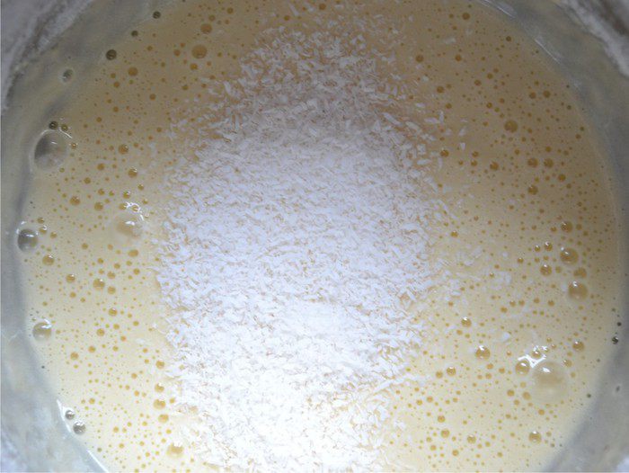 Делаем тесто для бисквитов. Яйца разбиваем в миску и начинаем их взбивать миксером, постепенно добавляя к ним 2 столовые ложки сахара, муку, миндаль, и в конце кокосовую стружку. Все перемешиваем.