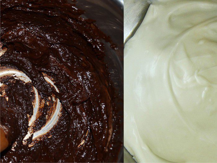 Берем две кастрюльки и в одной растапливаем на водяной бане темный шоколад, а в другой белый шоколад. Растопленный шоколад остужаем.
