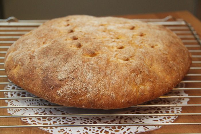 Выпекать при 250*С 10 минут, затем убавить температуру до 180*С и выпекать ещё 25 минут. Остудить хлеб на решётке.