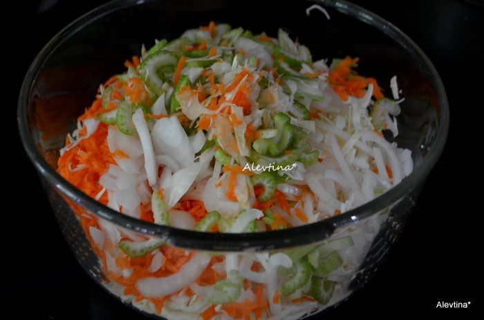 Капусту порубить, морковь на терке, лук тонко порезать, сельдерей стебли порезать не крупно.