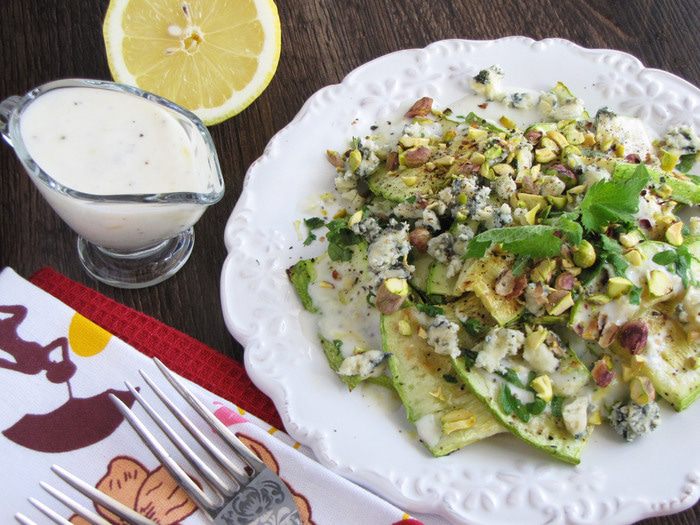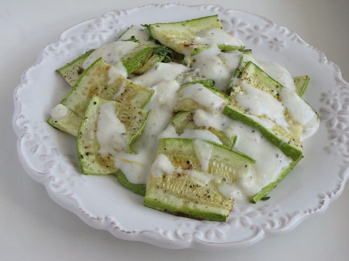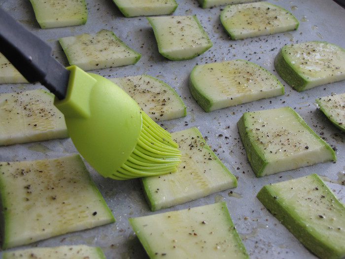 Кабачки, не очищая от кожуры, нарезать пластинками, толщиной 0,5 см. Противень застелить пекарской бумагой и немного смазать оливковым маслом. Выложить подготовленные кабачки, посолить и поперчить по вкусу. Смазать сверху оливковым маслом. Поставить в духовку и запекать при 180 градусах минут 20, до зарумянивания.