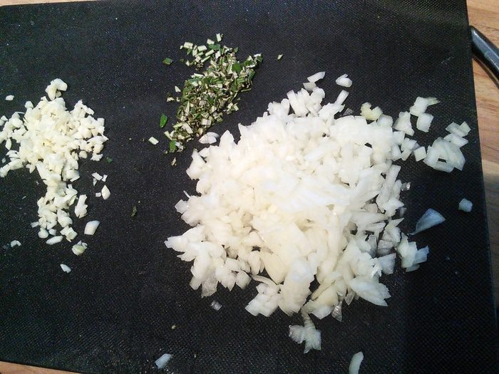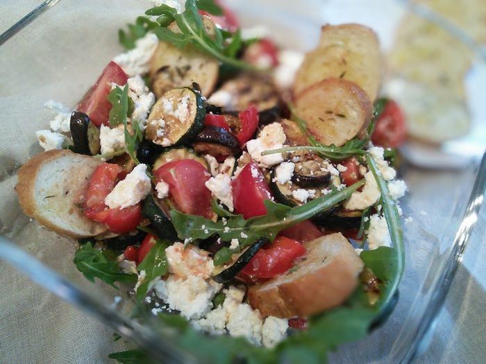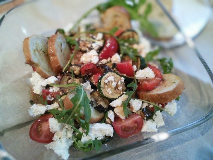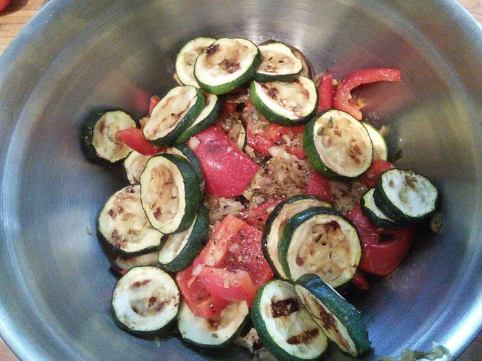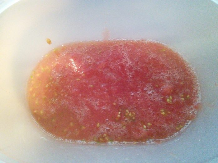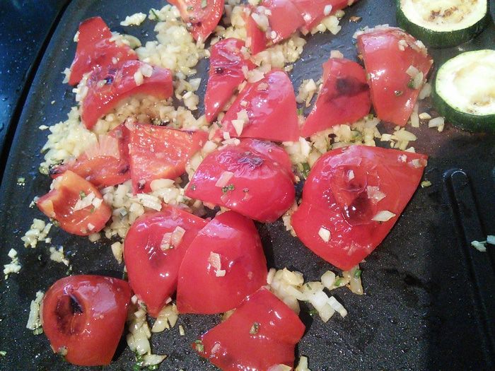 Приготовить заправку: для этого смешать бальзамический уксус с сахаром, солью, перцем и оливковым маслом, взболтать до образования эмульсии. Две из пяти помидор разрезать на половину, остальные на четвертинки (помидорки маленькие). Две разрезанные пополам натереть на тёрке и влить сок и мякоть помидоров в заправку. Ещё раз взболтать.