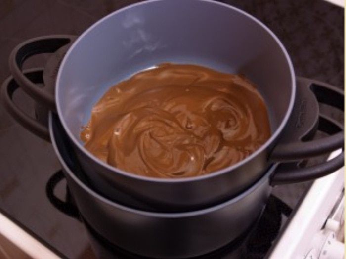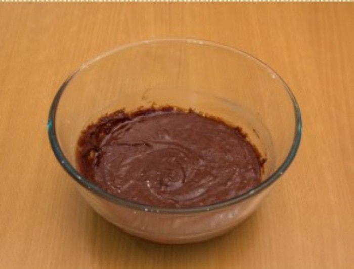 Когда шоколад растопится добавить в миску к маслу и яйцам и хорошо перемешать. Масса станет густой и однородной. Потом аккуратно добавляем муку с разрыхлителем. Тесто должно получится гуще чем на оладьи.