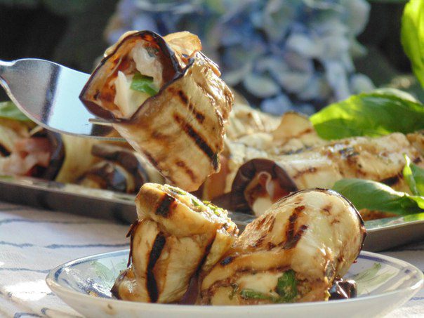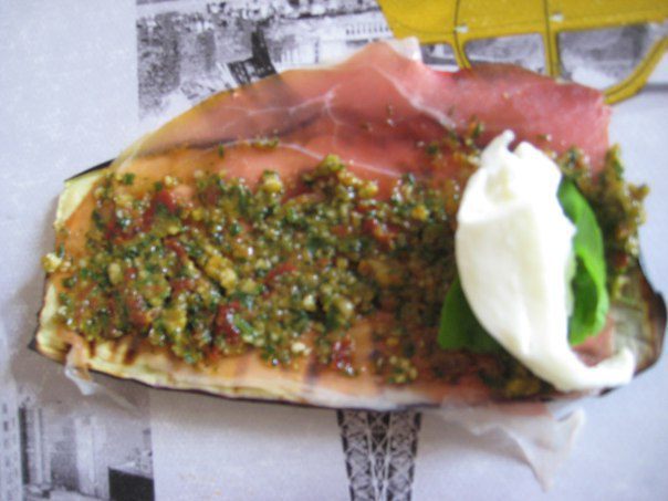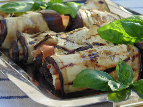 На пластинку баклажанов выложить по ломтику прошутто (сыровяленой ветчины), нанести пасту. Положить кусочек моцареллы, листик базилика, свернуть в рулетик.