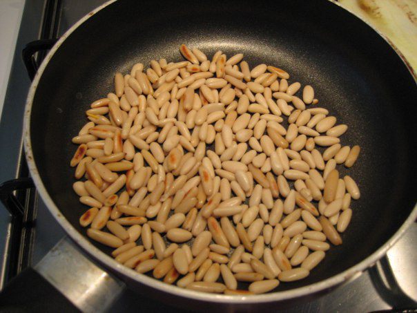 В блендере измельчить вяленые томаты, листья базилика (оставить немного), кедровые орешки, филе анчоусов, поперчить. Добавить оливковое масло и снова пробить.