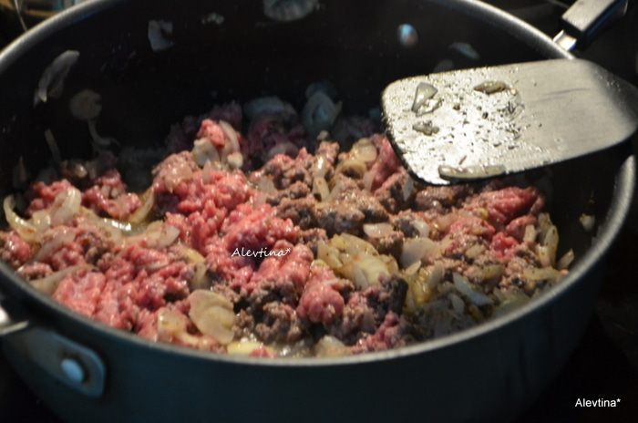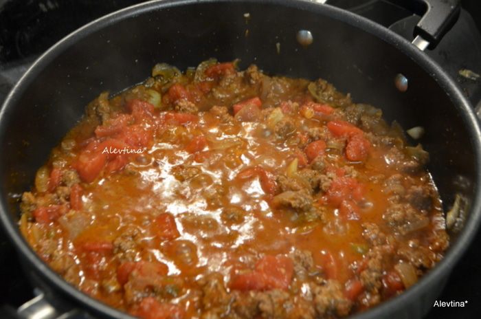 Обжарить на оливковом масле тонко порезанный лук и чеснок 5 мин. Добавить смесь итальянских сухих специй, красный перец хлопьями. Затем нежирный говяжий фарш. Обжариваем до коричневого цвета.