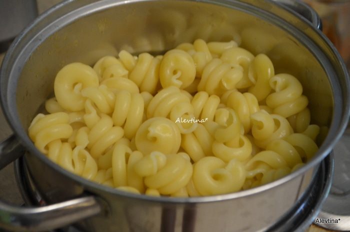 Отварить итальянскую пасту до готовности в подсоленной воде. Затем воду слить.