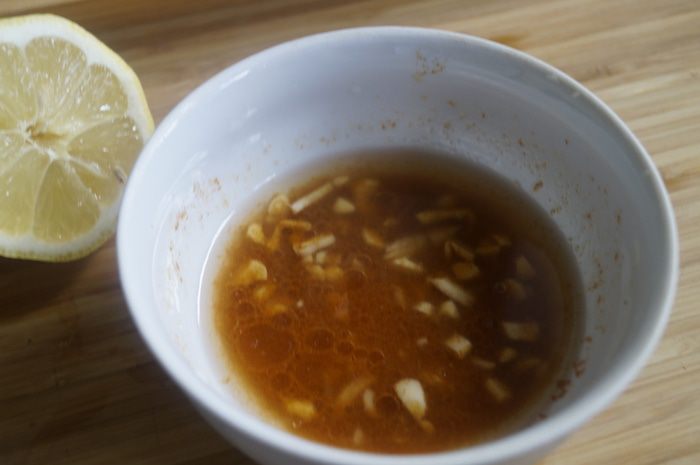 Для заправки смешать оливковое масло и лимонный сок, добавить паприку, тмин и соль, через пресс выдавить чеснок или мелко порубить. Все перемешать.
