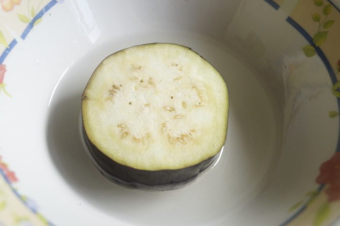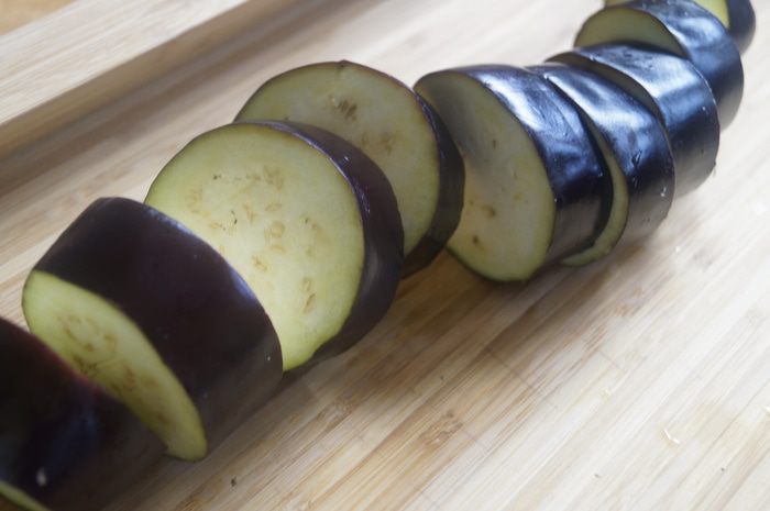 Баклажаны нарезать крупными кружочками, толщиной около 2 см.