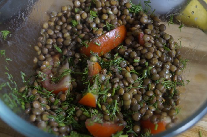 По вкусу он напоминает многим знакомую закуску "Тещин язык". Салат очень питательный за счет содержания в нем чечевицы.