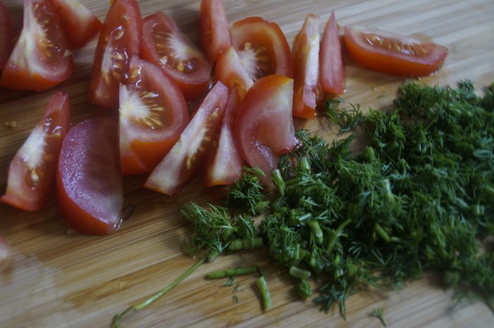 В глубокую чашу выложить чечевицу, помидоры и укроп, перемешать.