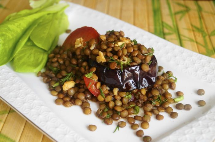 Предлагаю вашему вниманию очень вкусный и полезный салат. От него точно не смогут отказаться любители чечевицы, а также баклажанов.