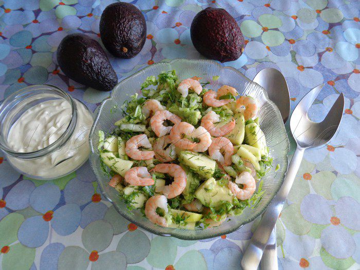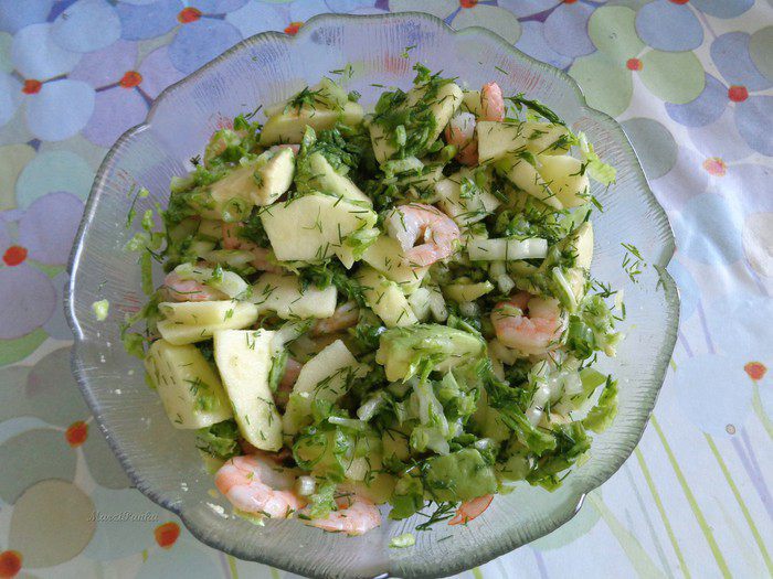 Очень вкусный, легкий салат с креветками, яблоком и авокадо. Он по-настоящему летний, можно смело отужинать им и не бояться за фигуру.