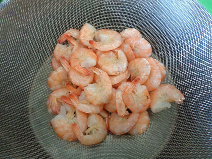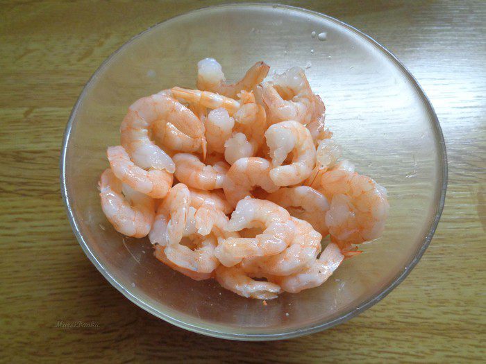 Очистите креветки от панциря и сбрызните лимонным соком. Отставьте в сторону для пропитки.