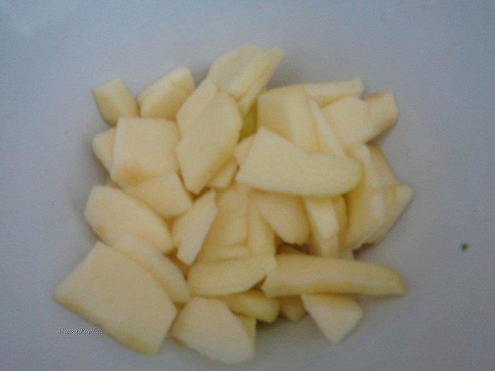 Почистите яблоко. Порежьте пластинками, а затем еще пополам и сбрызните лимонным соком, чтобы оно не потемнело.