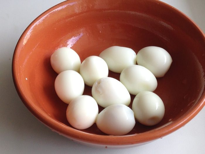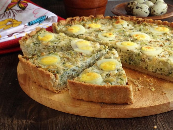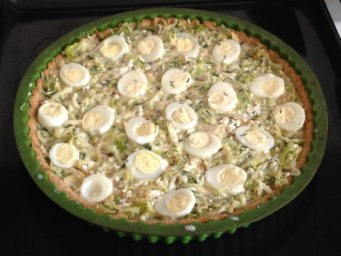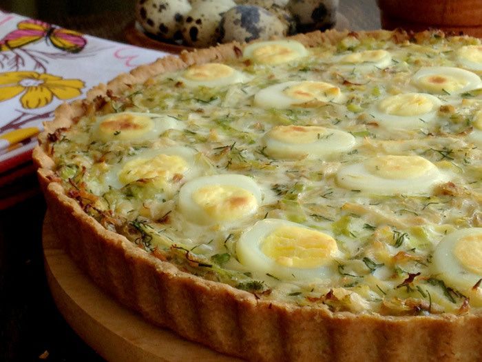 Вылить заливку на капусту, сверху разложить перепелиные яйца, разрезанные на половинки. Яйца немного вдавить в начинку. Снова поставить киш в духовку и выпекать 15 минут при 180 град.