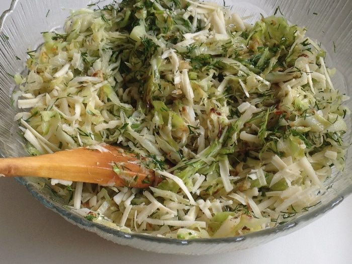 Капусту немного остудить и соединить с натертым на крупной терке сыром. Перемешать. Начинка готова. Отставим и ее в сторону и займемся тестом.