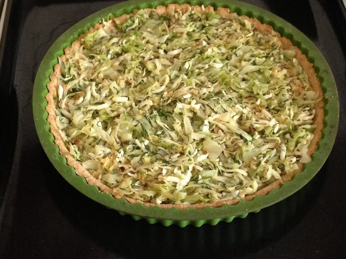 Убрать бумагу вместе с фасолью и выложить на основу капустную начинку, разровнять.