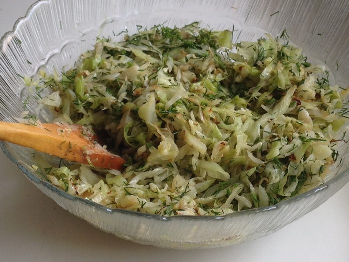 Переложить капусту в миску, посолить, добавить мелкорубленый укроп, перемешать.