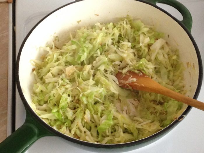 Молодую капусту тонко нашинковать и обжарить на оливковом масле до полуготовности.